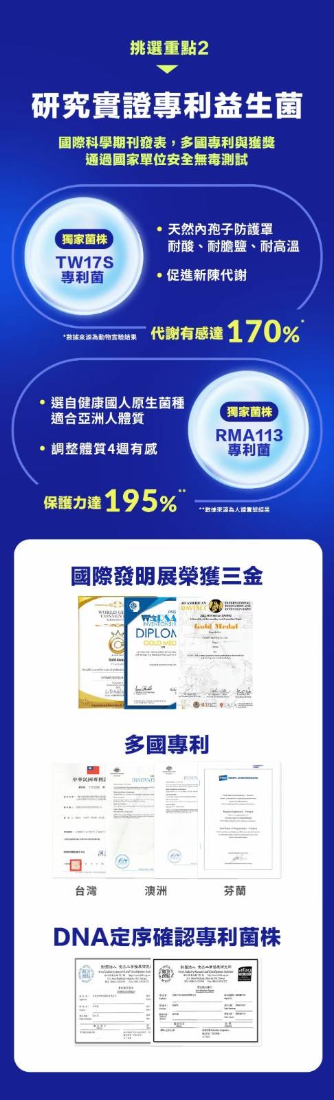 含獨家多國專利益生菌 TW17S 及 RMA113,代謝有感達 170%、保護力達195%,能幫助消化丶排便順暢丶維持消化道機能
