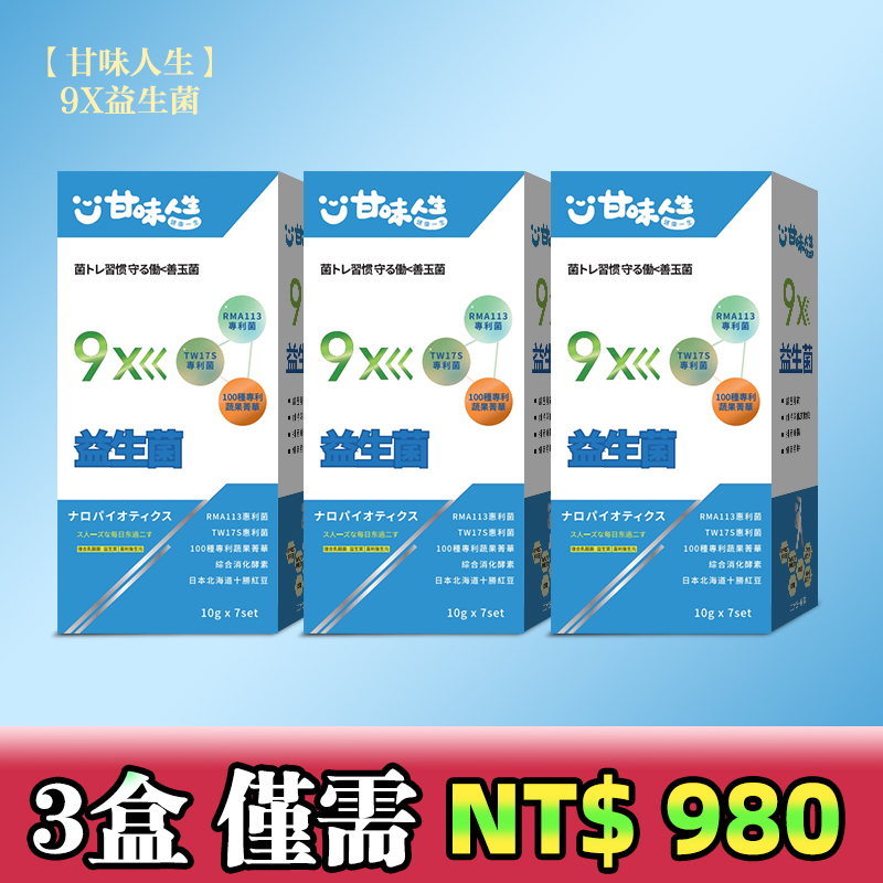 4分鐘前【甘味人生】9X益生菌 - 胡瓜輕鬆甩肉16公斤秘訣大公開 市售唯一次世代益生菌聯盟【益生菌+益生質+後生元】打造新時代益生菌纖瘦健康力 雙專利菌 加專利蔬果菁華 排便順暢 維持消化道機能 綜合消化酵素:幫助消化 燃燒代謝 佰億好菌 全家人都可以吃 9大菌株 6大專利 3大功能面面俱到 越活越青春!【規格:10gx7set】 - 3盒 買二送一【甘味人生】9X益生菌 【限量199组】暴瘦4-6公斤!!-僅需 NT$980