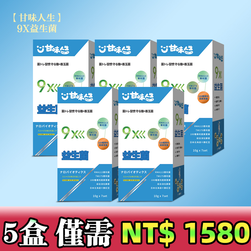 半小時前【甘味人生】9X益生菌 - 胡瓜輕鬆甩肉16公斤秘訣大公開 市售唯一次世代益生菌聯盟【益生菌+益生質+後生元】打造新時代益生菌纖瘦健康力 雙專利菌 加專利蔬果菁華 排便順暢 維持消化道機能 綜合消化酵素:幫助消化 燃燒代謝 佰億好菌 全家人都可以吃 9大菌株 6大專利 3大功能面面俱到 越活越青春!【規格:10gx7set】 - 5盒 買四送一【甘味人生】9X益生菌 【限量199組】暴瘦8-12公斤!!-僅需 NT$1580