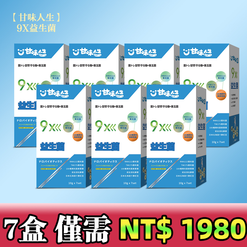 半小時前【甘味人生】9X益生菌 - 胡瓜輕鬆甩肉16公斤秘訣大公開 市售唯一次世代益生菌聯盟【益生菌+益生質+後生元】打造新時代益生菌纖瘦健康力 雙專利菌 加專利蔬果菁華 排便順暢 維持消化道機能 綜合消化酵素:幫助消化 燃燒代謝 佰億好菌 全家人都可以吃 9大菌株 6大專利 3大功能面面俱到 越活越青春!【規格:10gx7set】 - 7盒 買六送一【甘味人生】9X益生菌 【限量199組】暴瘦15-20公斤!!-僅需 NT$1980